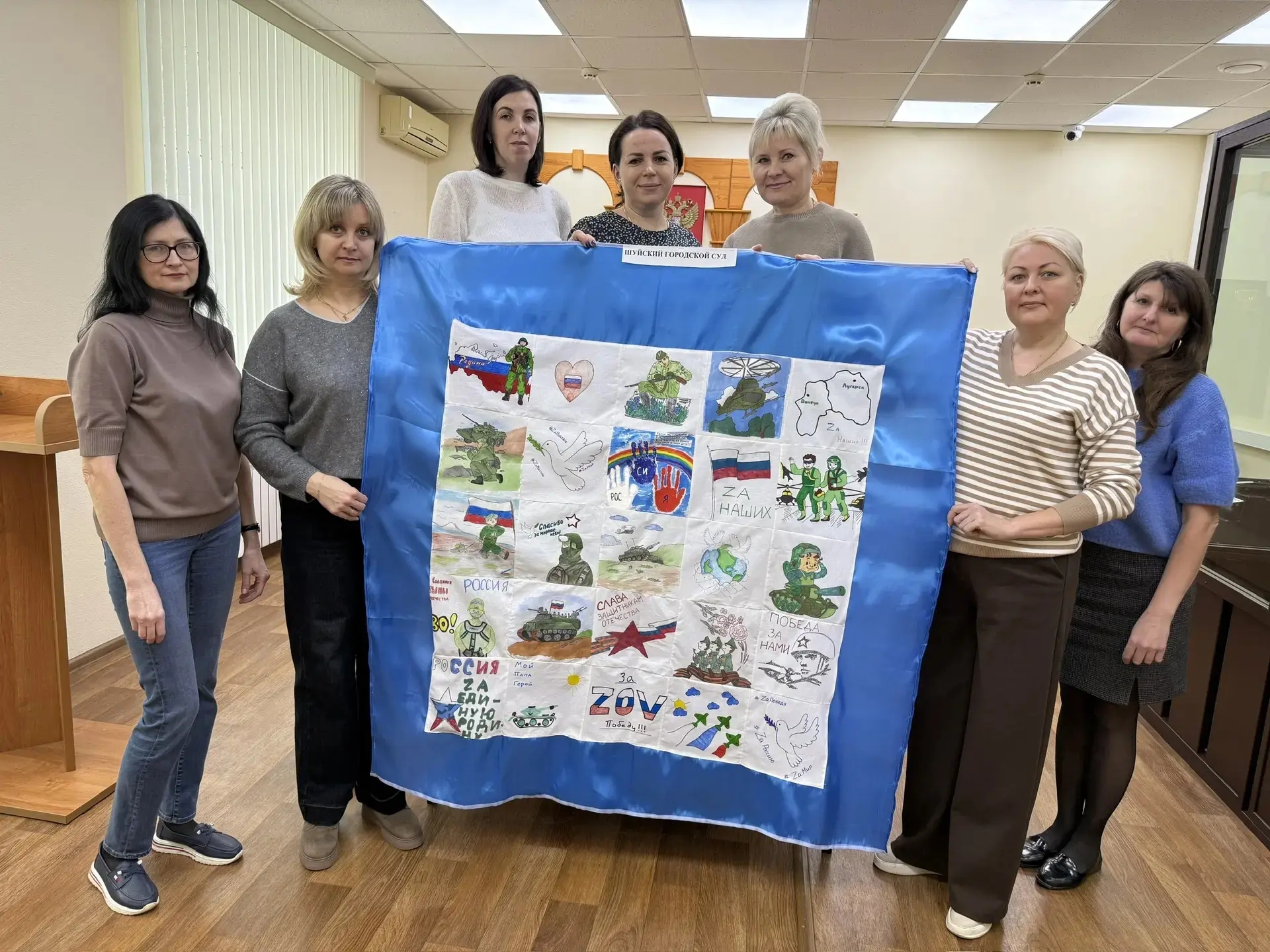 Дети судей и сотрудников аппарата суда подготовили на ткани рисунки, которые оформили в единое панно, которое будет передано через волонтёров военнослужащим ВС РФ, несущим службу в зоне специальной военной операции. Пресс-служба Шуйского городского суда ![]() |